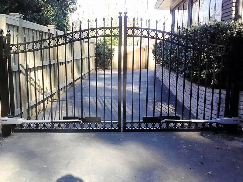 The automation for the metal gate is a Liftmaster LA 400 system that works with remote controls as the owners roll down the street nearing their home.